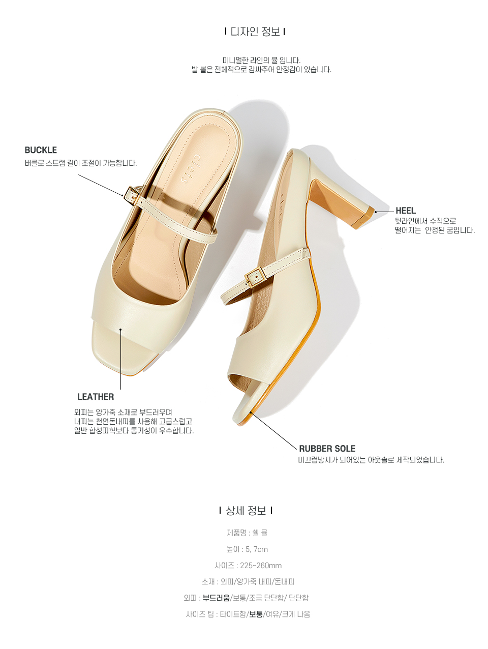발볼을 전체적으로 감싸주어 안정감이 있고 라인이 심플한 뮬 입니다.